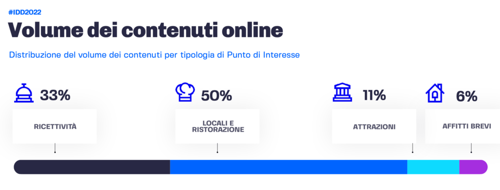La ricettività copre il 16% dei punti di interesse a livello nazionale, ma raccoglie il 33% di tutti i contenuti scritti online dai viaggiatori. Al contrario, solo il 6% delle recensioni riguarda gli affitti brevi. Questo dimostra quanto sia ancora molto significativo il ruolo dell’offerta ricettiva sulla reputazione complessiva della destinazione, secondo solo al F&B (50%) che però raccoglie il 43% dei POI.