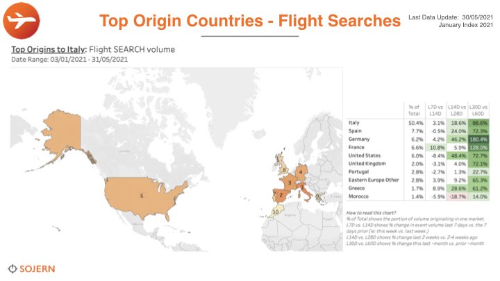 Moreover, flight searches and bookings from the Italian domestic market have escalated since January 2021 recording +249% in searches and +598% in bookings.