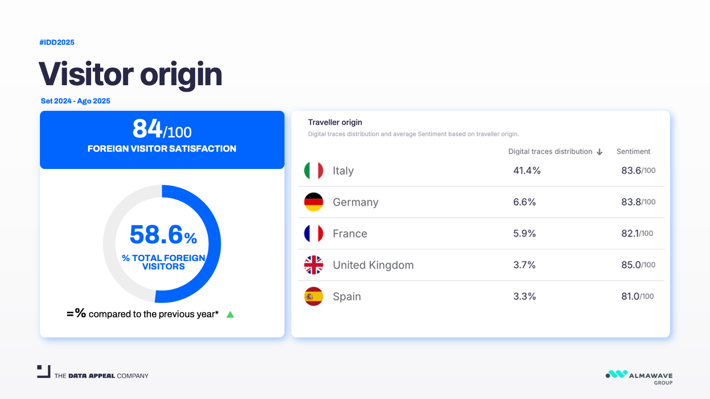 Based on an extensive analysis of 29.5 million digital traces from September 2024 to August 2025, covering 772,800 points of interest across accommodation, attractions, dining, and more, a fascinating picture emerges—one of evolution, diversification, and deepening personal connections. These insights are drawn from D / AI Destinations, the comprehensive destination marketing and management platform, in collaboration with Mabrian, a Data Appeal company. All the following insights are taken from our annual comprehensive report, All Italian Data 2025, where you can explore the following insights and more.