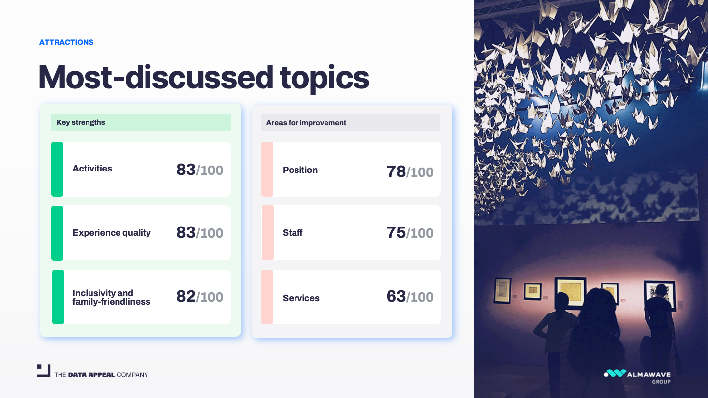 Despite representing just 6.7% of all attractions analysed, they generate 15% of total attraction content, with an impressive average sentiment of 90.2/100.