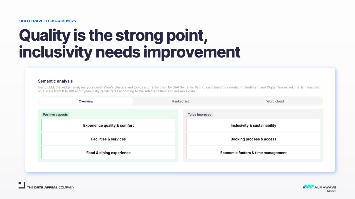 These gaps represent clear opportunities for Italian tourism businesses to better serve this growing, high-engagement segment. Solo travellers tend to stay longer, explore more deeply, and share their experiences more actively—making them particularly valuable visitors.