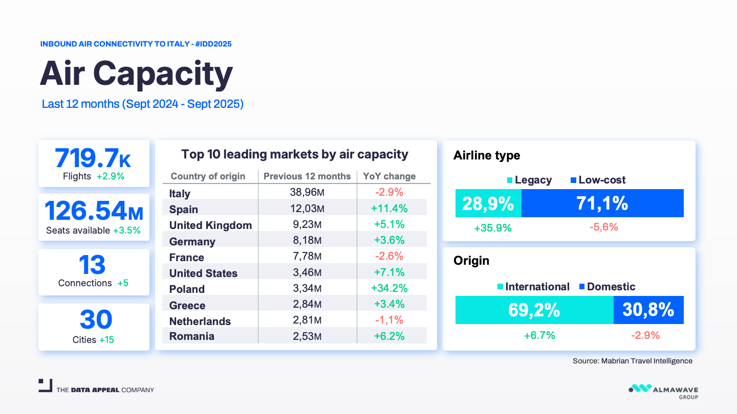 Seats available increased 3.5% YoY to 126.54 million, with flights up 2.9% to 719,700. This growth is mostly driven by low-cost carriers, which now represent 71.1% of all flights to and from Italy—a crucial shift in accessibility and affordability.