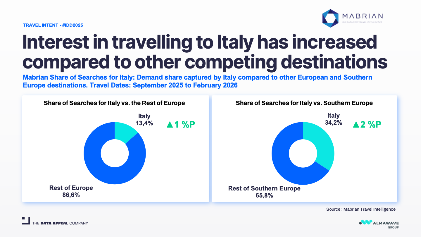 Italy is strengthening its lead in European tourism, now accounting for 34.2% of all travel searches for Southern Europe—up 2 percentage points from last year. This marks a notable gain in market share amid strong competition from Spain, Greece, and Portugal.