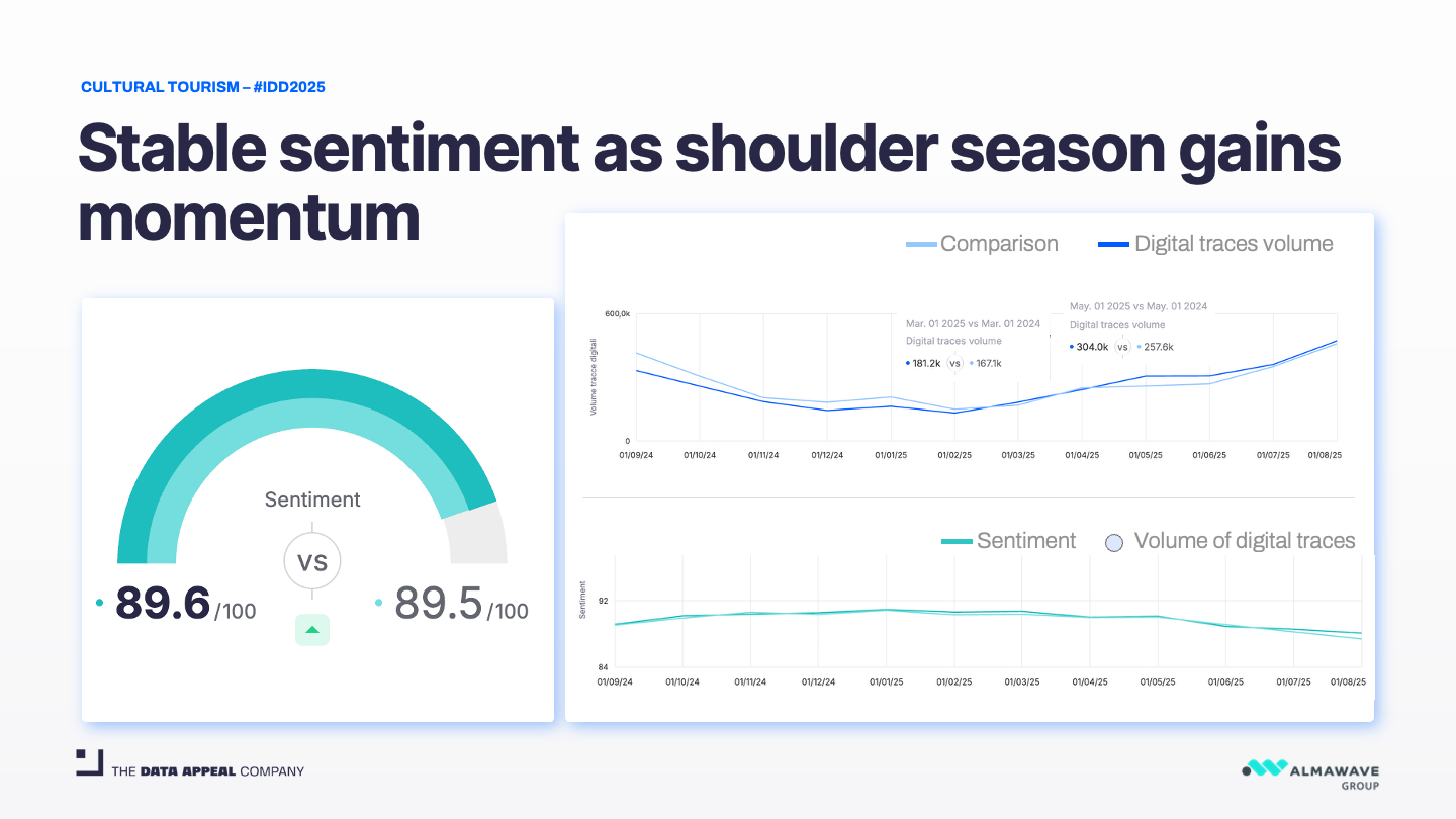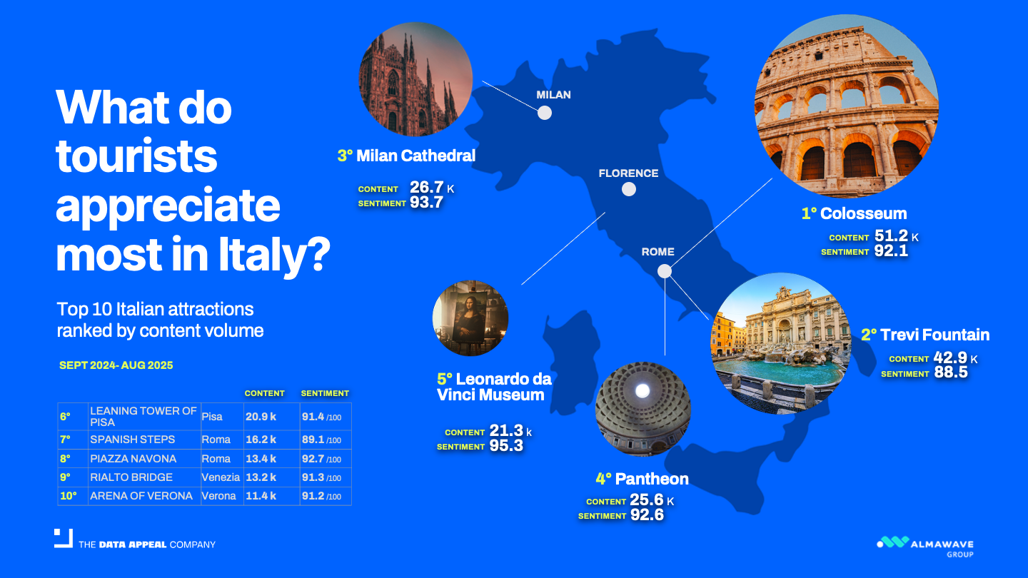 Based on an extensive analysis of 29.5 million digital traces from September 2024 to August 2025, covering 772,800 points of interest across accommodation, attractions, dining, and more, a fascinating picture emerges—one of evolution, diversification, and deepening personal connections. These insights are drawn from D / AI Destinations, the comprehensive destination marketing and management platform, in collaboration with Mabrian, a Data Appeal company. All the following insights are taken from our annual comprehensive report, All Italian Data 2025, where you can explore the following insights and more.